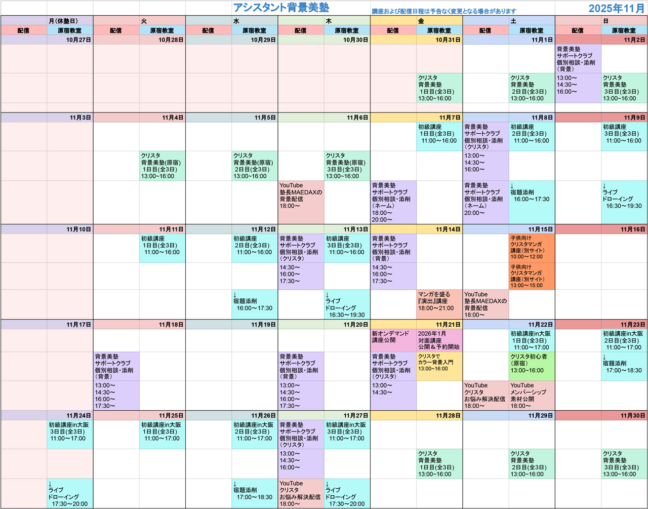 2025.09.19 2025年11月 講座公開のお知らせ ■2025年11月講座のご予約はこちら■ 2025年11月の原宿教室での講座スケジュールを公開しました。※10/3更新 原宿教室の対面講座 初級講座 クリスタ初心者 クリスタ背景美塾 マンガを盛る演出講座 クリスタでカラー背景入門 ■2025年11月講座のご予約はこちら■
